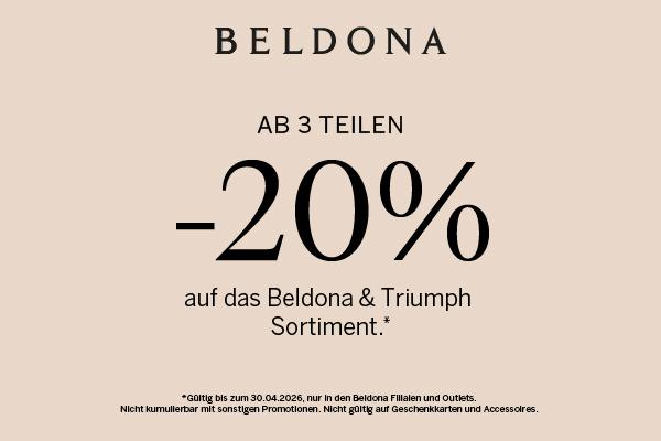 Jetzt ist die perfekte Gelegenheit, deine Wäschegarderobe zu erneuern: Wähle mindestens drei Teile aus dem hochwertigen Beldona‑ und Triumph‑Sortiment und profitiere von 20 % Rabatt auf deinen Einkauf. BHs, Slips, Dessous oder Loungewear – kombiniere ganz nach deinem Stil.